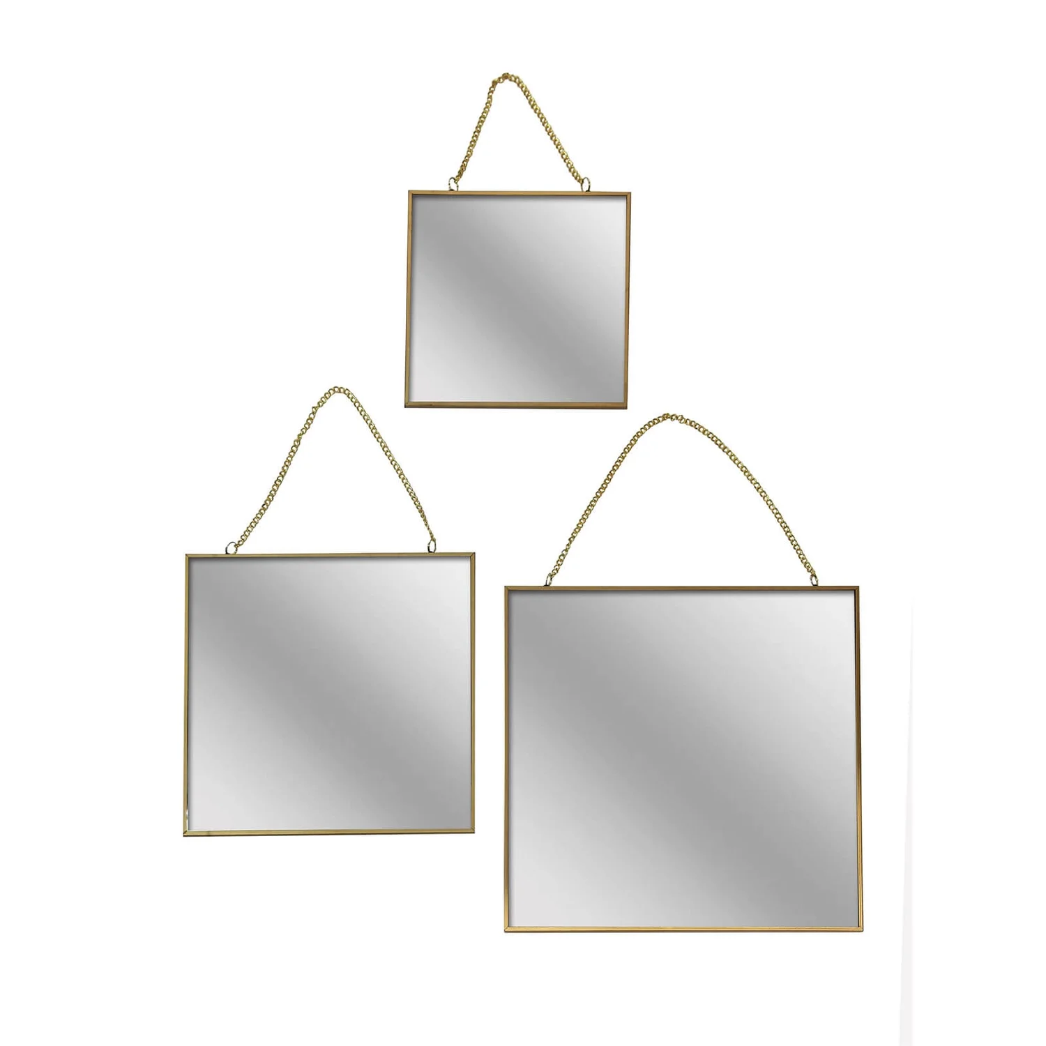 Set of 3 square mirrors framed in brass. Completed with fine golden chains and loops for hanging. Hang them together or separately for a custom look in any living, dining or bedroom.