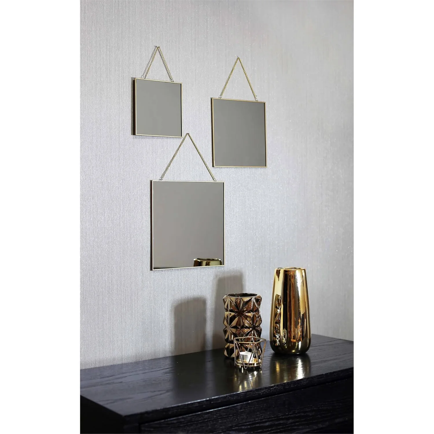 | Product Dimensions (H)x(W)x(D) | Arthouse x Set of 3 square mirrors framed in brass. Completed with fine golden chains and loops for hanging. Hang them together or separately for a custom look in any living, dining or bedroom. x Ready to hangcm |