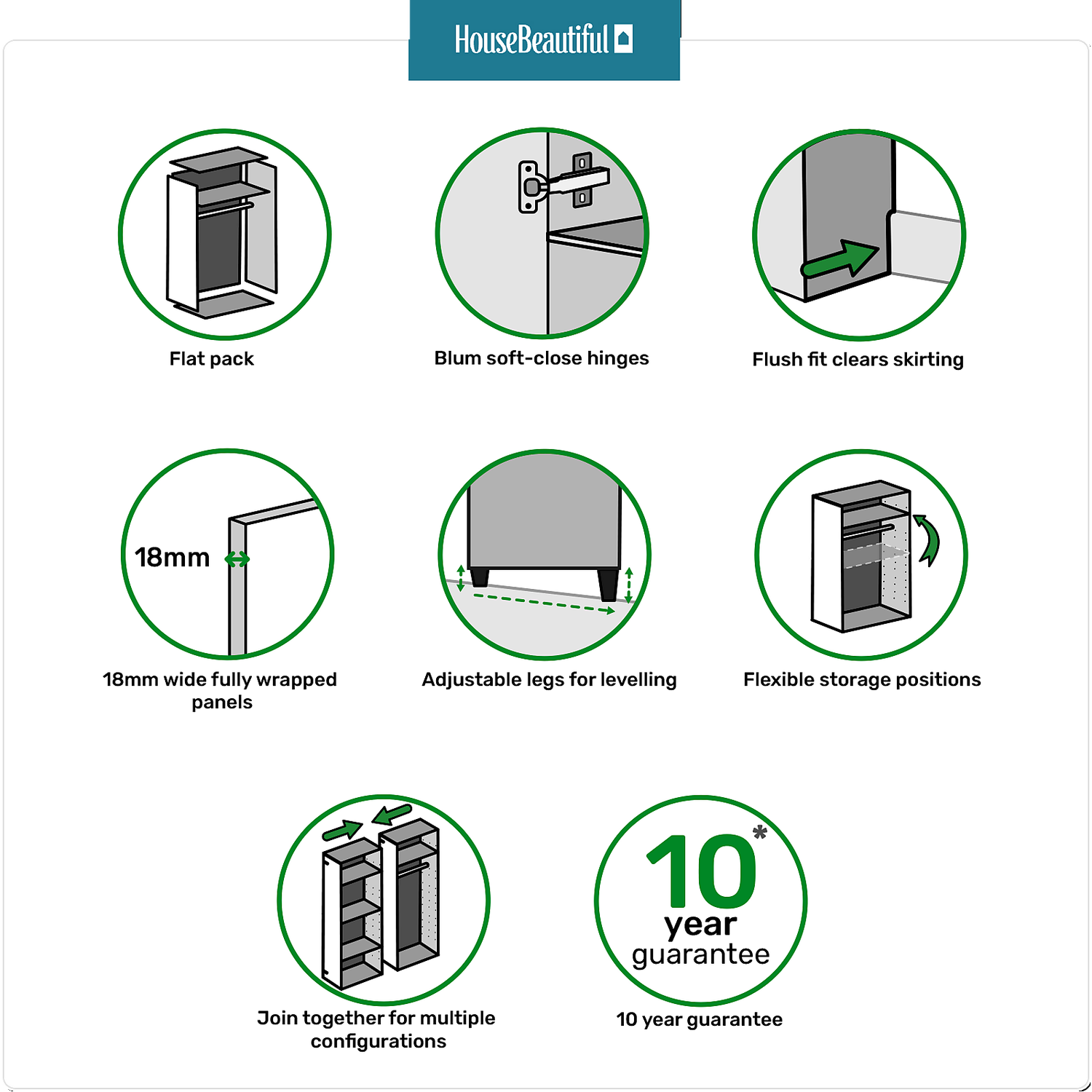 The House Beautiful range is exclusive to Homebase and offers a selection of different finishes and storage configurations to suit your needs. With a range of carcass colours and contrasting door designs, you can select the look to fit your bedroom aesthetic. The House Beautiful range now includes the fully fitted look with this combination pack which includes the wardrobe, end panels, plinth and cornice, meaning you can complete your bedroom with a luxury look. Coordinating chests of drawers are also available separately. This triple wardrobe (1 x double unit and 1 x single unit) features a white internal carcass and includes end panels, plinth and matching cornice all in a finish to match the beautiful luxe gloss grey slab doors. The wardrobe features premium soft close clip-on Blum hinges, two shelves and two hanging rails. You can customise your wardrobe with our additional internal storage options (available separately) including internal drawers, shelves, dividing shelves and extra hanging rails. Choose your handles from our range of both traditional and modern to suit your desired look.